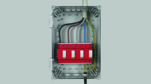 Lightning-current-tested insulating enclosure for arresters with a capacity of six modules; with knockouts for cable entry and plug-in glands; ideally suited for feed-through wiring.