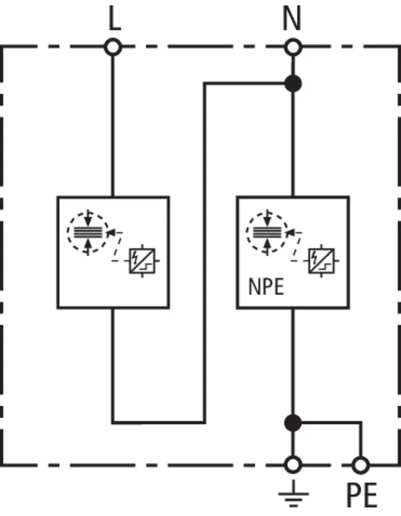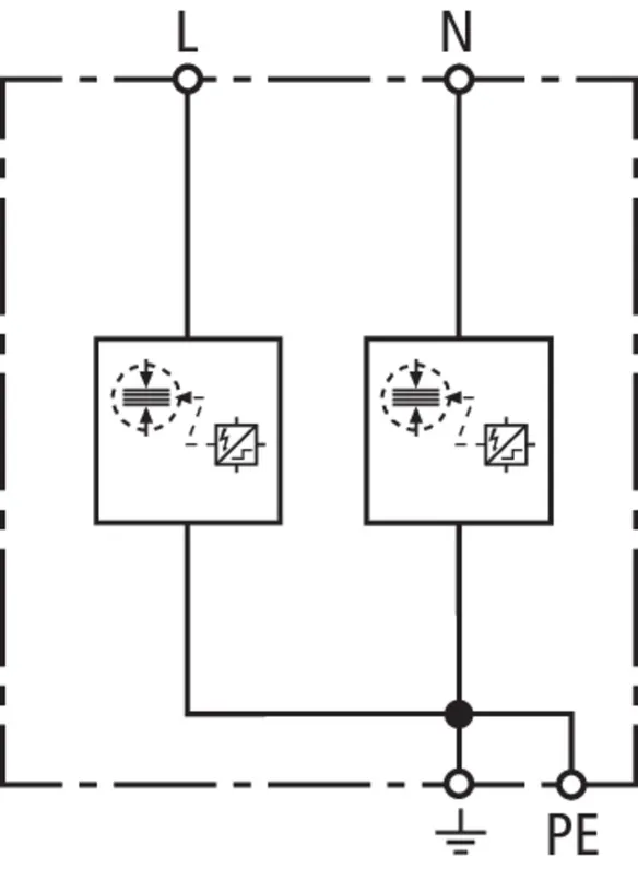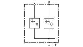 Application-optimised and prewired combined lightning current and surge arrester for single-phase TN systems with a nominal voltage of 230 V (2+0 configuration).