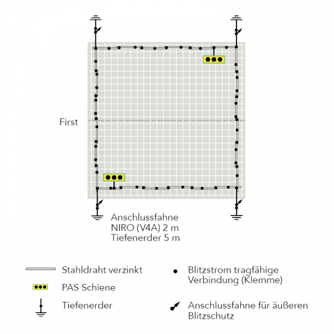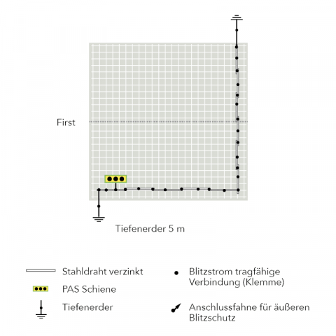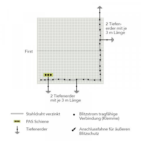 Unsere Empfehlung: Mit einer kombinierten Potentialausgleichsanlage sind Sie für zukünftige Veränderungen an der elektrischen Anlage, z. B. die Errichtung eines äußeren Blitzschutzsystems, gerüstet. Für die Umsetzung ist 2x das Erdungsset erforderlich.
