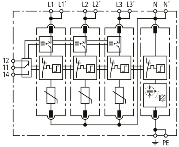 Modular surge arrester with Advanced Circuit Interruption (ACI) for TN-S systems (4+0 configuration); with floating remote signalling contact.