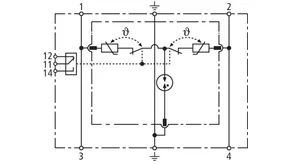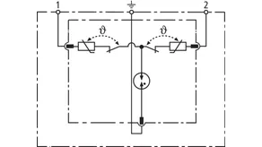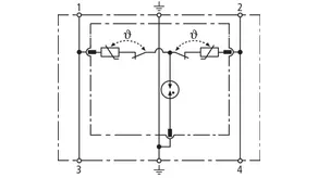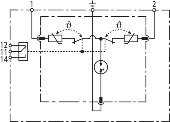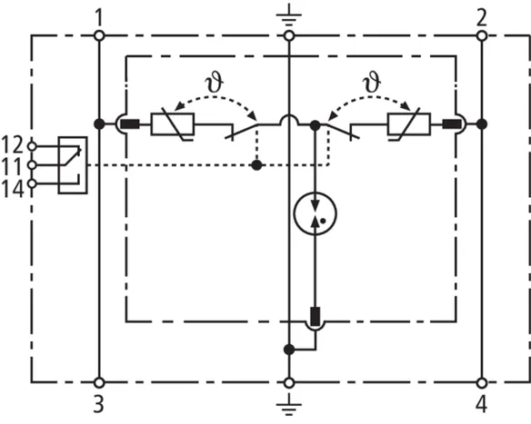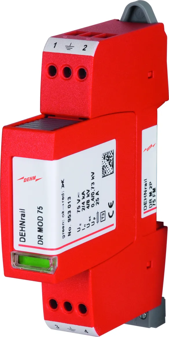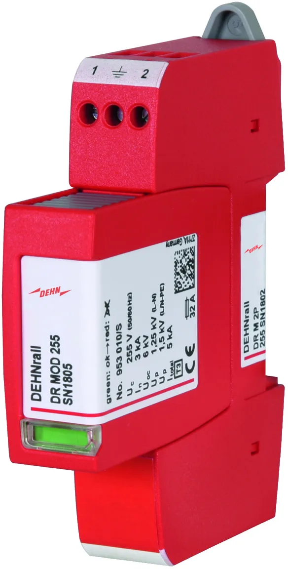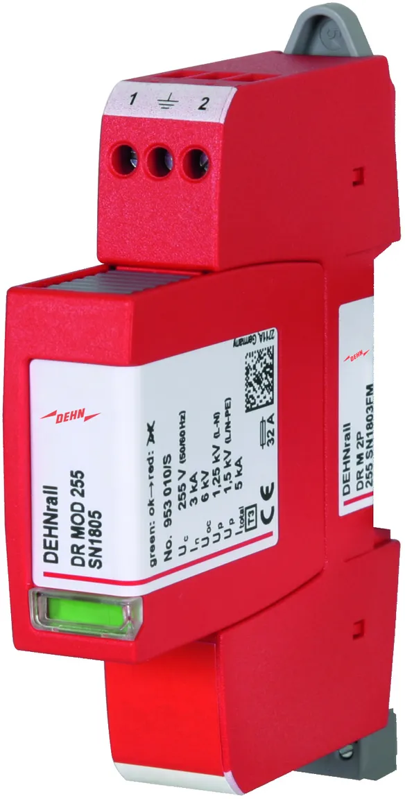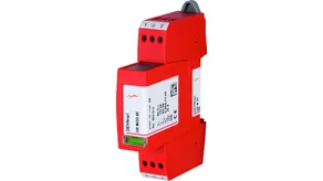 Two-pole surge arrester consisting of a base part and a plug-in protection module; with floating remote signalling contact. Can be used for systems with a load current up to 32 A.