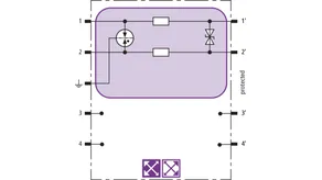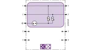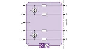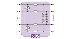Space-saving surge arrester module with RFID LifeCheck for protecting two pairs of stranded signal interfaces. If LifeCheck detects thermal or electrical overload, the arrester has to be replaced. This status is indicated contactlessly by the DEHNrecord LC / SCM / MCM reader.