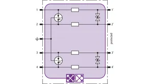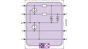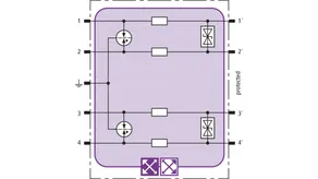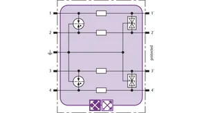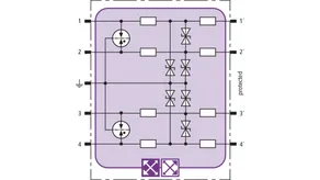 Space-saving combined lightning current and surge arrester module with RFID LifeCheck for protecting four single lines sharing a common reference potential as well as unbalanced interfaces. If LifeCheck detects thermal or electrical overload, the arrester has to be replaced. This status is indicated contactlessly by the DEHNrecord LC / SCM / MCM reader.