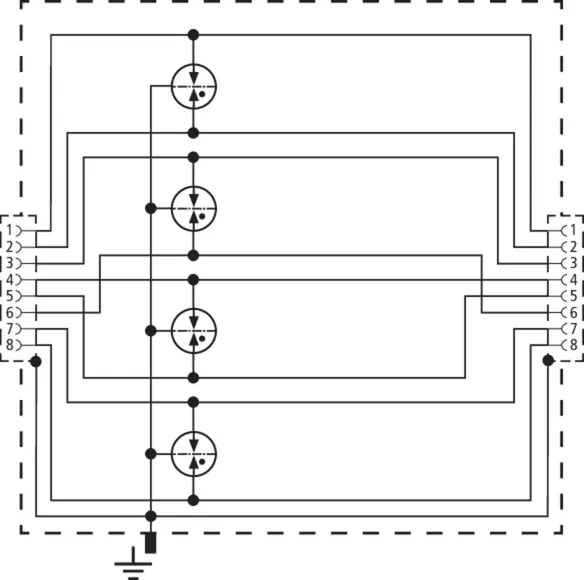 Universal, space-saving lightning current arrester of 19 mm in width and RJ45 connection system for lightning equipotential bonding. Protection of applications in structured cabling according to class S to 100 MHz; e.g. industrial Ethernet, data distributors, digital camera systems, Power over Ethernet (IEEE 802.3 compliant to 4PPoE) and Ethernet-based interfaces in general. Protection of all pairs through powerful gas discharge tubes. Fully shielded adapter design with RJ45 sockets for DIN rail mounting. With additional screw connection on the enclosure for an optional earth connection.