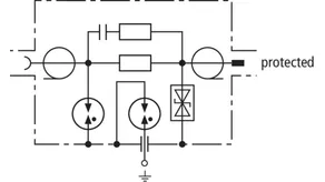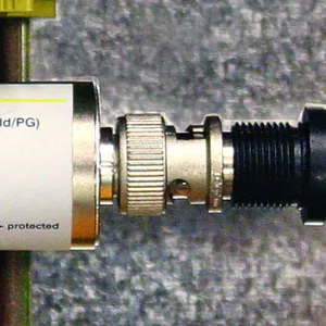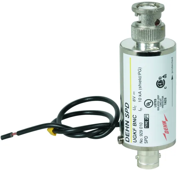 Two-stage surge arrester with indirect shield earthing for protecting video cameras and Arcnet with BNC connection to avoid ground loops.