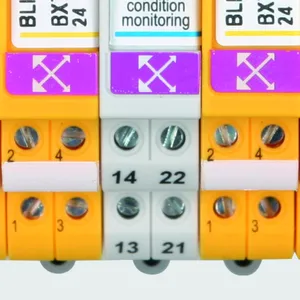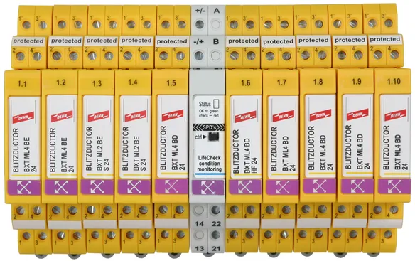 DIN rail mounted device with integrated RFID LifeCheck sensor for condition monitoring of up to ten BLITZDUCTOR XT / XTU arresters with RFID LifeCheck technology. Visual operating state indication via three-colour LED combined with remote signalling function (break contact).