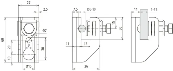 Thrust piece with M8 screw for installing flat strips up to 11 mm and round conductors 6-10 mm.