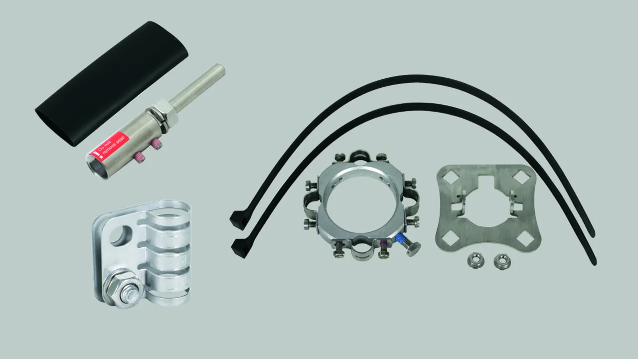 Fixing kit for mounting the HVI light Conductor on the supporting tube Ø50 mm (e.g. HVI long supporting tube), consisting of a connection plate (for four conductors, incl. two self-locking nuts) and a fixing ring with four slotted conductor holders (Ø17 mm) for the adjustment range (incl. two cable ties).