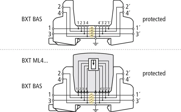 The BLITZDUCTOR XT base part is an extremely space-saving and universal four-pole feed-through terminal for the insertion of a protection module without signal disconnection if the protection module is removed. The snap-in mechanism at the supporting foot of the base part allows the protection module to be safely earthed via the DIN rail. Since no components of the protective circuit are situated in the base part, maintenance is only required for the protection modules.