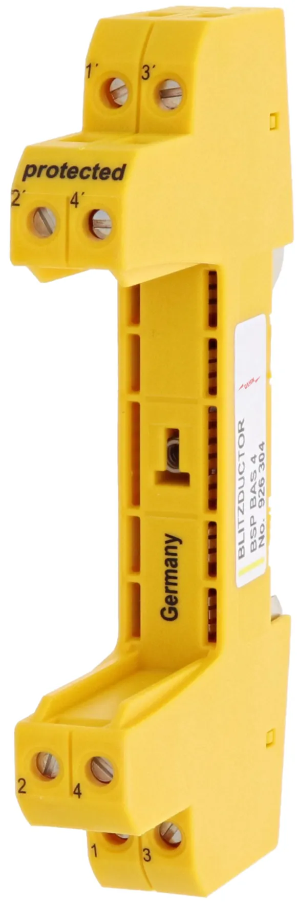 The BLITZDUCTOR SP base part is an extremely space-saving and universal four-pole terminal for the insertion of a protection module with signal disconnection if the protection module is removed. The snap-in mechanism at the supporting foot of the base part allows the protection module to be safely earthed via the DIN rail. Since no components of the protective circuit are situated in the base part, maintenance operation is only required for the protection modules.