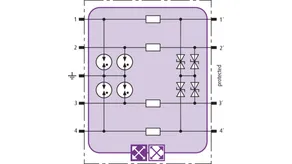 Space-saving surge arrester module with RFID LifeCheck for protecting two pairs in intrinsically safe measuring circuits and bus systems, meets FISCO requirements. ATEX. Insulation strength > 500 V line-earth.