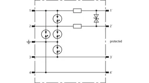 Space-saving surge arrester module with RFID LifeCheck for protecting up to four unearthed single lines sharing a common reference potential in intrinsically safe measuring circuits, meets FISCO requirements. ATEX. Insulation strength > 500 V line-earth.