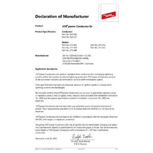 The HVI power Conductoris suitable for use in hazardous areas of Ex zone 1 (gases, vapours, mist) and Ex zone 21 (dust). The special installation conditions safely prevent electric sparks to neighbouring metal parts when lightning current flows through the HVI power Conductor.